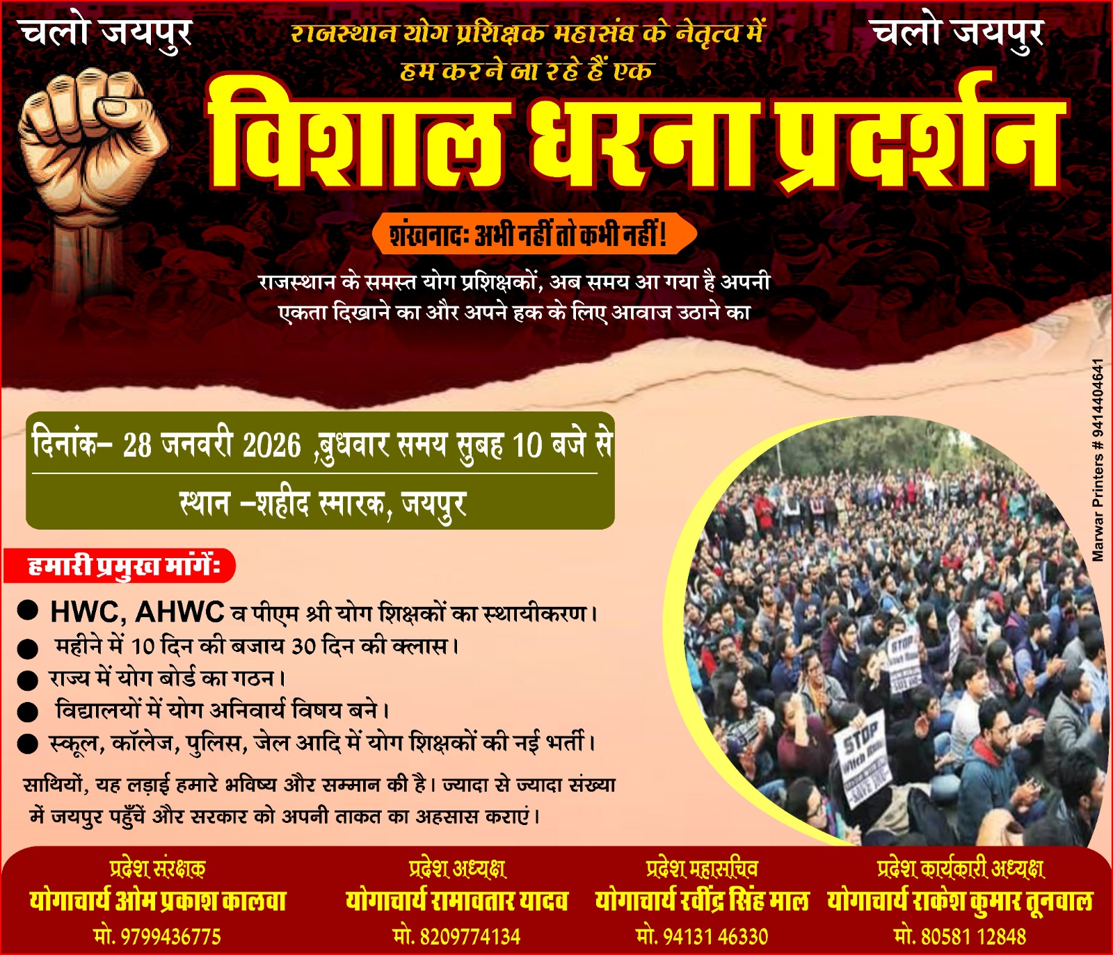 Jaipur में 28 जनवरी को योग शिक्षकों का महाधरना, स्थायीकरण और 27 हजार मानदेय की मांग पर आर-पार की लड़ाई राजस्थान के कोने-कोने में सुलग रही विरोध की आग, ऑनलाइन ‘वार रूम‘ से तैयार हो रही महा-आंदोलन की रणनीति राजस्थान की राजधानी जयपुर में आगामी 28 जनवरी 2026 को एक ऐसा मंजर देखने को … Read more